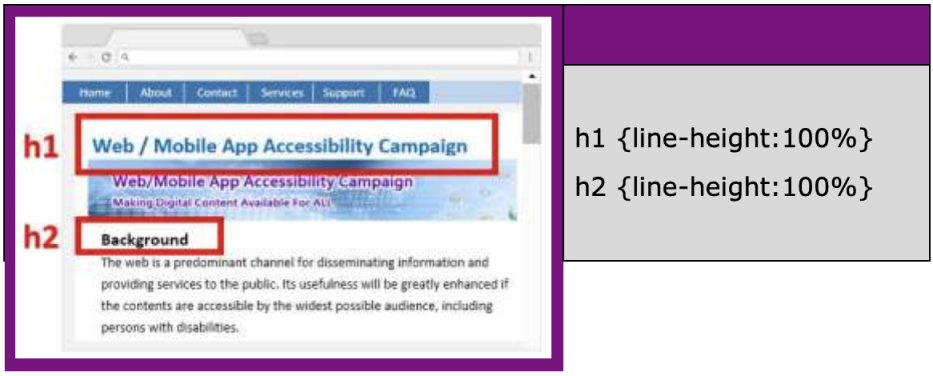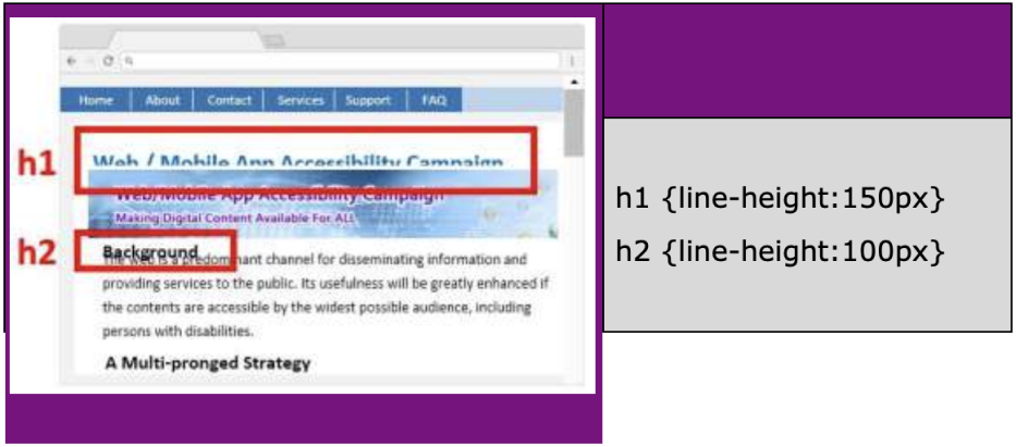 h1 {line-height:100%} h2 {line-height:100%} The line height of h1 and h2 is defined using relative values (i.e. percentage). When the page is zoomed by the user, the line height of h1 and h2 is changed accordingly such that the content can be displayed clearly.