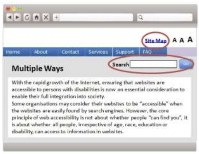 In this image, a search function and a site map have been included for users to have multiple methods available to locate the required information. Something like a site map would also be helpful to users who have learning disabilities or have difficulties in concentrating for a long period of time.