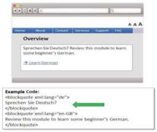 In the example above, the majority of the website is in English. However, a small section is in German. In this case, it is essential to define this change in language, so that screen readers can detect the change and pronounce correctly.