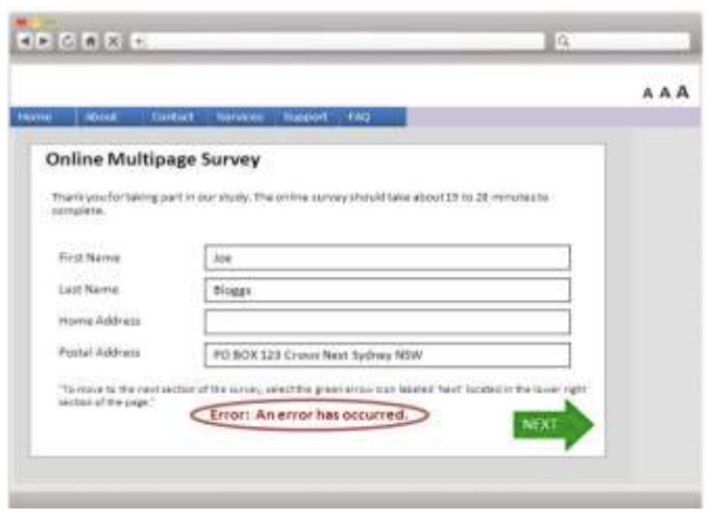 The example above shows an error message that is not helpful enough because it is located at the bottom of the webpage, and does not provide an adequate description of what needs to be corrected.
