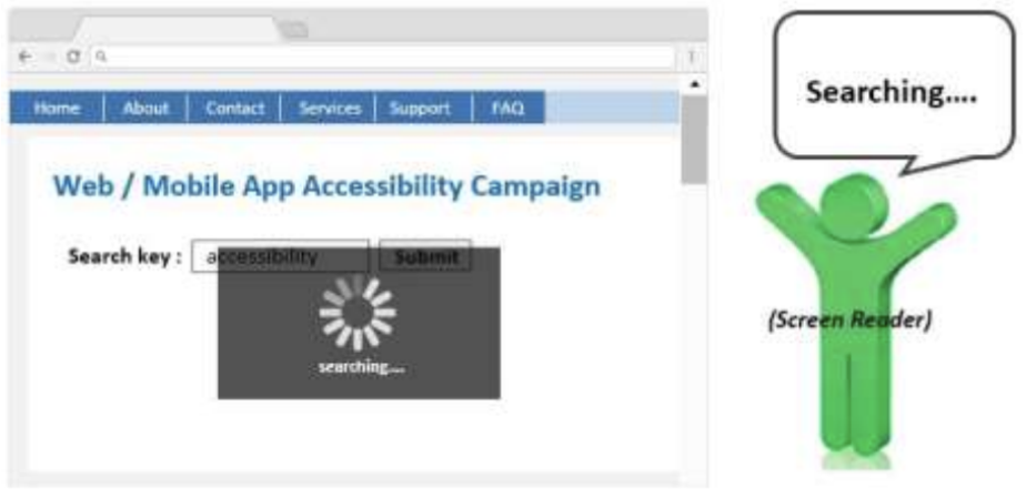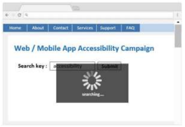 A spinning logo with “searching” status message appears after user initiates the search function. However, screen reader cannot read out the status message because it is not in focus.