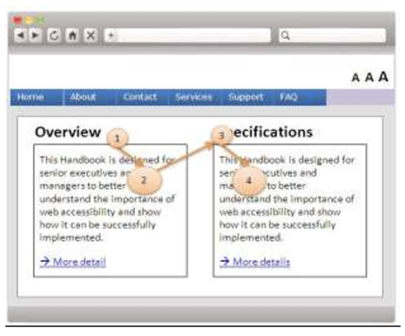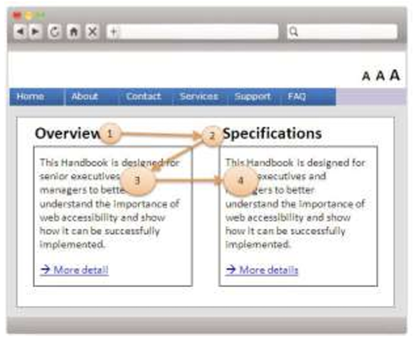Developers may also adopt cascading style sheet techniques that allow important items to be presented first within the code and hence be read first by screen readers.